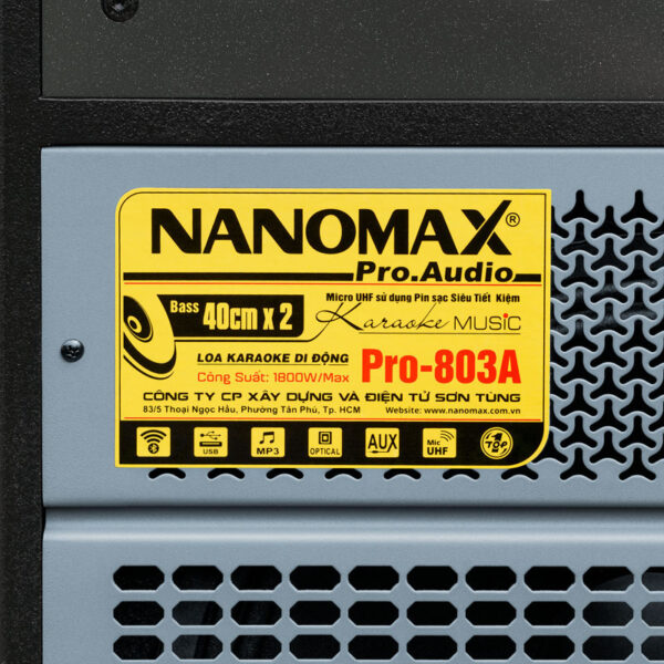 Nanomax Pro-803A ra đời nhằm phục vụ phân khúc bass đôi giá tầm trung nhưng vẫn sở hữu đầy đủ 2 loa bass 40cm, 2 loa mid 16cm và 4 loa treble còi. Với ngoại hình đẹp tinh tế, công suất cực đại lên đến 1800w… Nanomax Pro-803A đủ để đáp ứng karaoke và nghe nhạc không gian rộng ngoài trời.